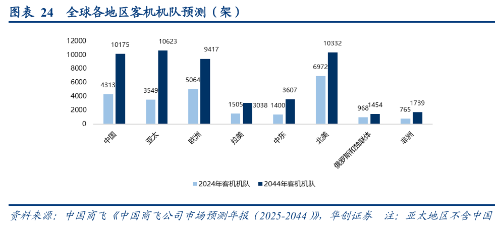 根据《中国商飞公司市场预测年报(2025-2044)》,预计到2044年,中国航空市场将拥有10175架客机,2024-2044年复合增长率为4.4%,其中单通道喷气客机(窄体机)7639架,双通道喷气客机(宽体机)1750架,喷气支线客机786架。中国航空市场将成为全球最大单一航空市场。
