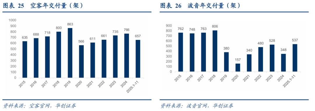 空客与波音在历史最高交付年份合计交付1669架(空客19年交付863架,波音2018年交付806架)。注:25年尚未恢复到高峰水平。