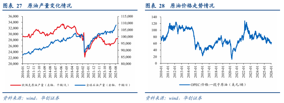 2020年,受疫情影响,原油产量下降。随后,全球各国陆续从疫情中走出,经济活动开始复苏,带动了原油需求恢复,原油价格快速上涨。2022年年初,俄乌冲突再次影响全球原油供给,至2022年3月,欧佩克一揽子原油价格达到128.27美元/桶。自2023年起,油价有所回落,截至2026年1月22日,欧佩克一揽子原油价格均价为63.21美元/桶,较2022年高位回落明显。