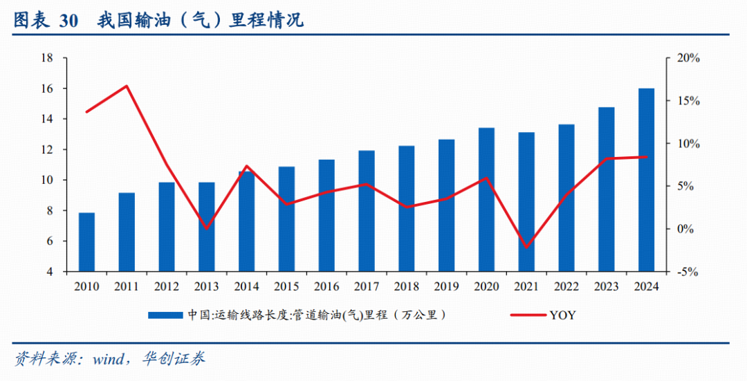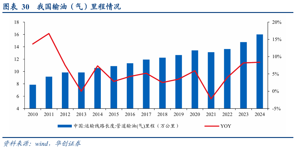 根据统计局统计数据,截至2024年,我国管道输油、输气管道里程达到16.00万公里,同比增长8.40%。未来,随着我国进一步增强能源供应链稳定性和安全性需求,对于油气输送管道需求仍有望保持增长。