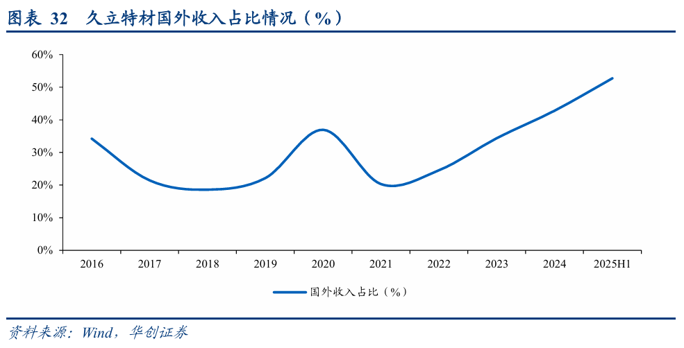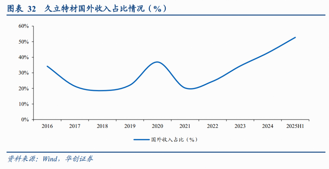 2、公司竞争优势:镍基合金油井管高壁垒,助力公司扩宽市场份额。公司投资建设的年产3000镍基合金油井管项目已实现投产,镍基合金油井管生产技术难度较大,存在技术壁垒。市场拓展方面,公司高端产品已成功进入海外市场,25H1海外收入占比达到53%,提升较为显著。