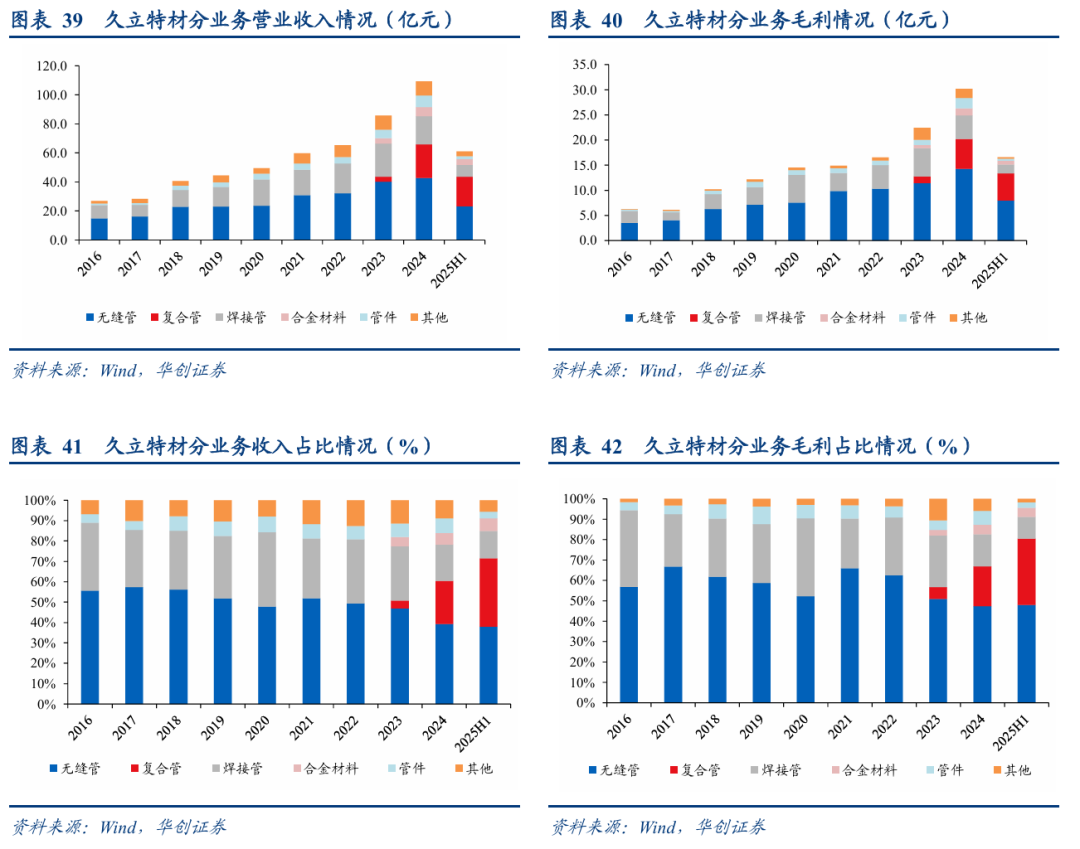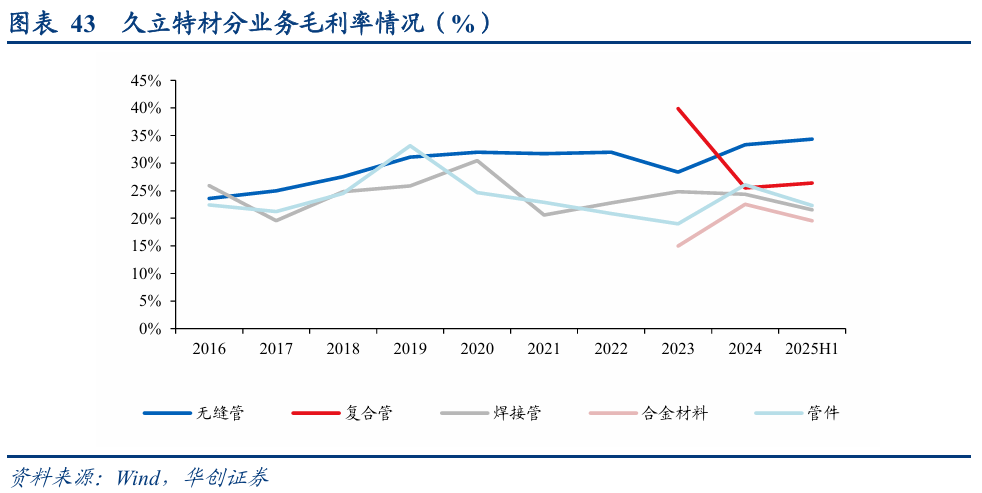 分业务看毛利:2025H1,公司无缝管、复合管、焊接管、合金材料以及管件业务的毛利分别为8.0、5.4、1.8、0.7、0.4亿元,同比分别为 27.8%、 246.1%、-26.0%、-9.2%、-52.2%。2025H1,公司无缝管、复合管分别贡献了约48%、33%的毛利来源,两者合计毛利占比达到81%。