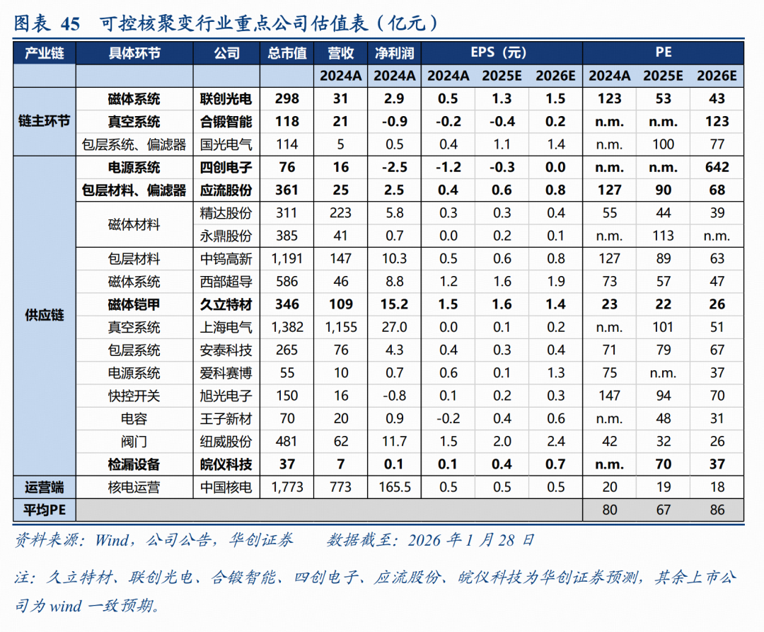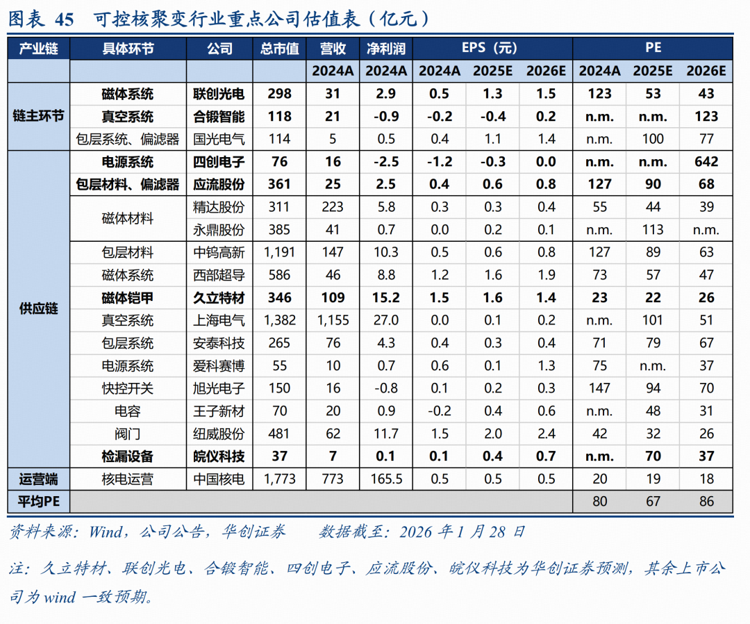 估值探讨:我们选取可控核聚变供应链环节制造端主要标的,2026-27年平均PE约为49、39倍,利润体量超10亿的公司对应27年PE平均同样超过30倍;