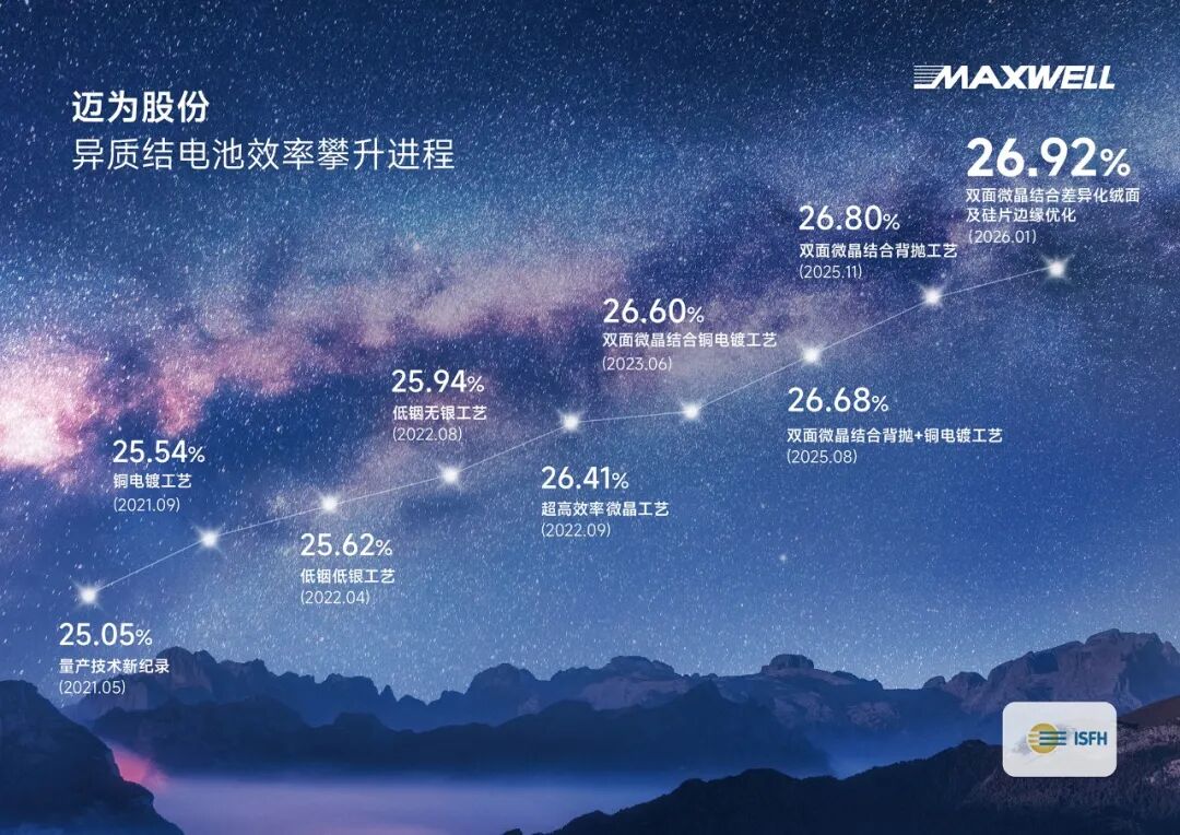 2021年5月,迈为股份研制的异质结电池首次实现量产技术新纪录,达25.05%;至2026年1月,以26.92%刷新该项技术的世界纪录。一次又一次的效率认证,见证了公司进无止境的创新追寻与技术突破。1.87%的增长曲线,既是效率提升路线,也是对经济性、可量产异质结技术路径的清晰勾勒。