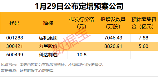 1月29日共有3家公司公布非公开发行预案。科达制造(600499)复牌后强势涨停。