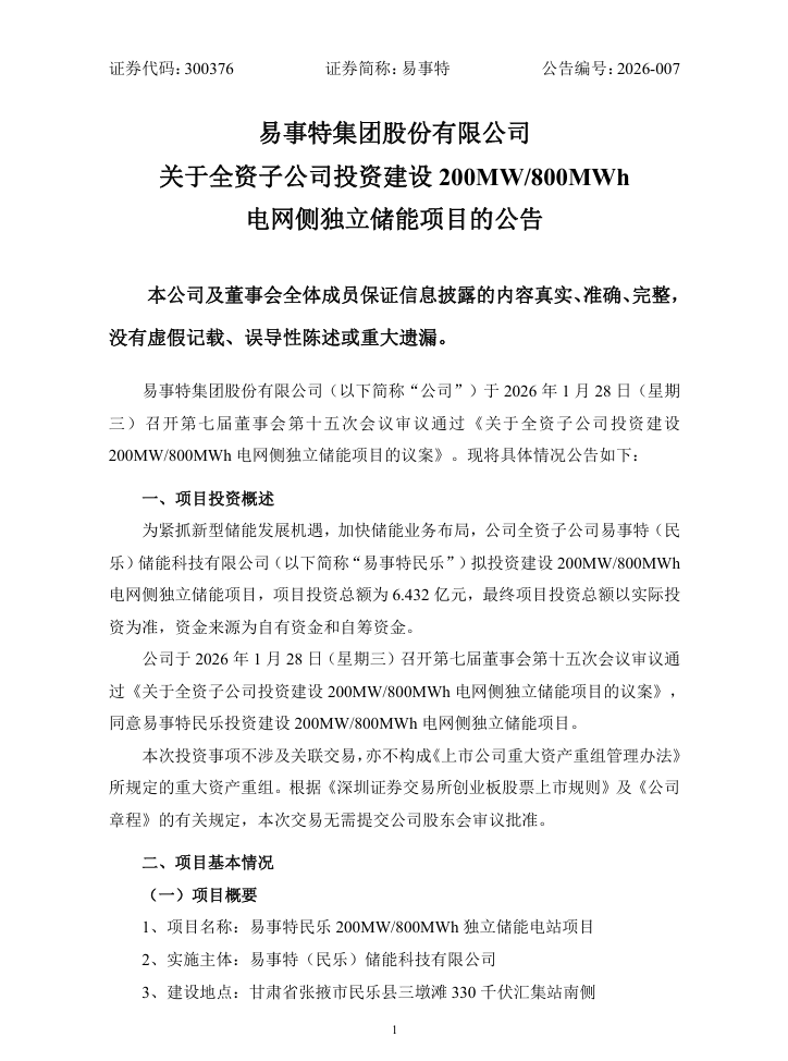 1月29日消息,昨日晚间,易事特发布公告称,公司全资子公司易事特(民乐)储能科技有限公司拟投资建设200MW/800MWh电网侧独立储能项目,项目投资总额为6.432亿元,资金来源为自有资金和自筹资金。
