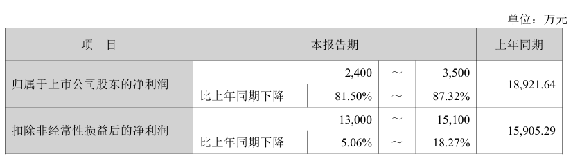 经财务部门初步测算,预计2025年归属于上市公司股东的净利润2,400万元—3,500万元,比上年同期下降81.50%—87.32%,扣除非经常性损益后的净利润13,000万元—15,100万元,比上年同期下降5.06%—18.27%。