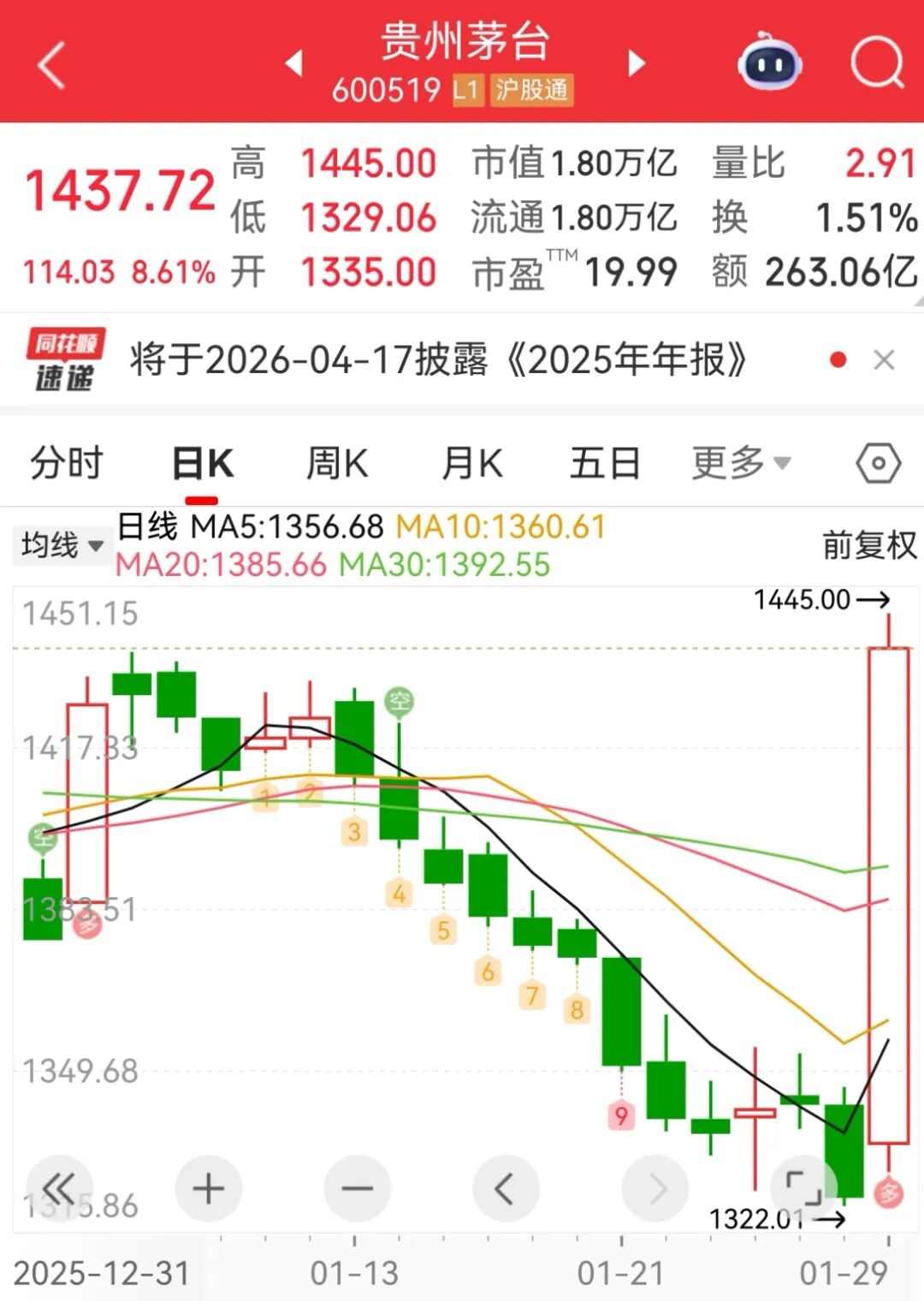 消息面上,据酒业数据平台“今日酒价”显示,1月29日,茅台酒继续上涨,已经突破1600元关口。其中,25年飞天茅台(原)批发价为1610元/瓶,较前一日涨20元;25年飞天茅台(散)价格报1620元/瓶,较前一日涨20元。同时,部分茅台省区直营店已出现飞天茅台“库存不足”的情况,仅在i茅台申购成功者能保证有现货。