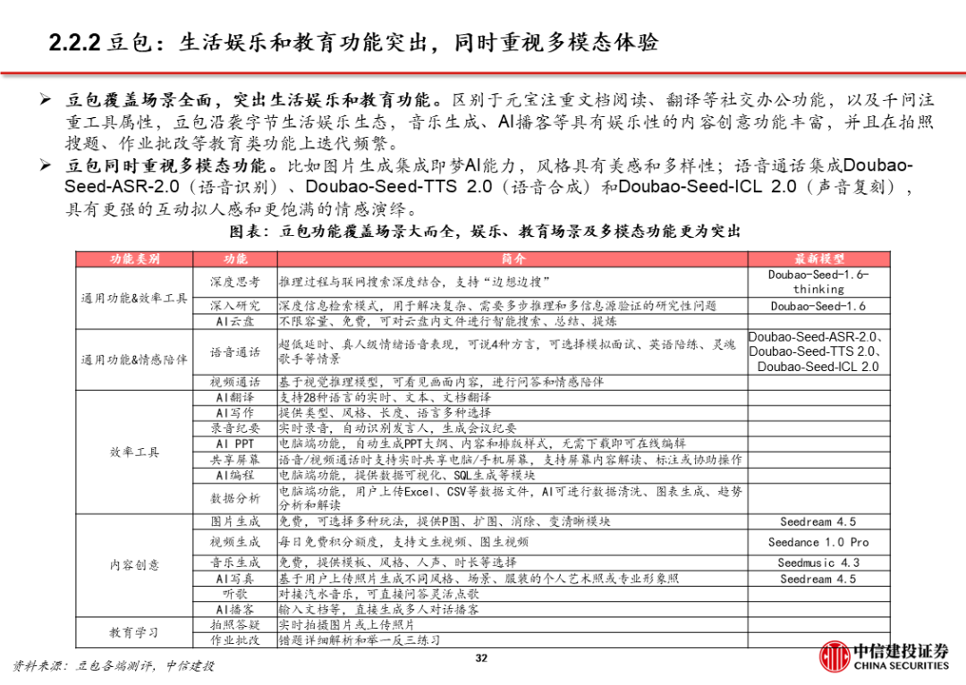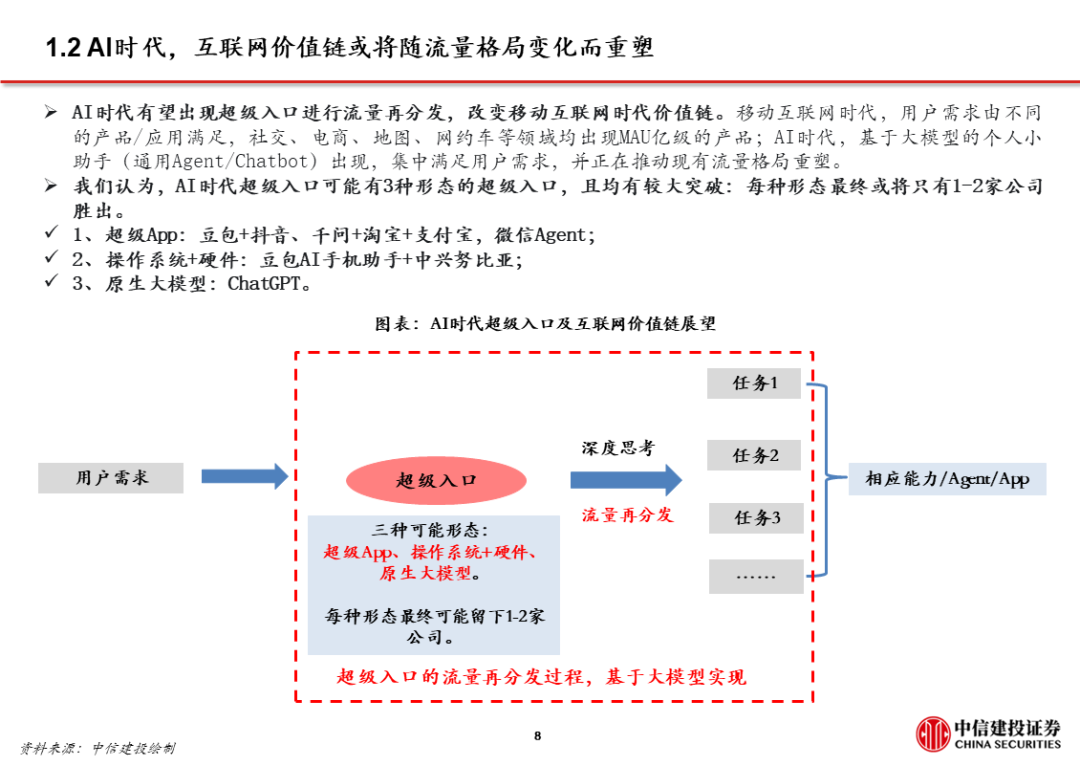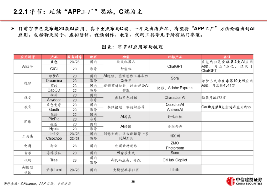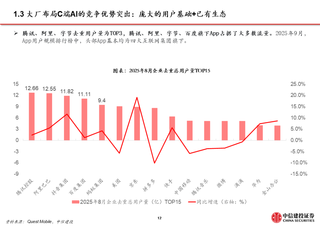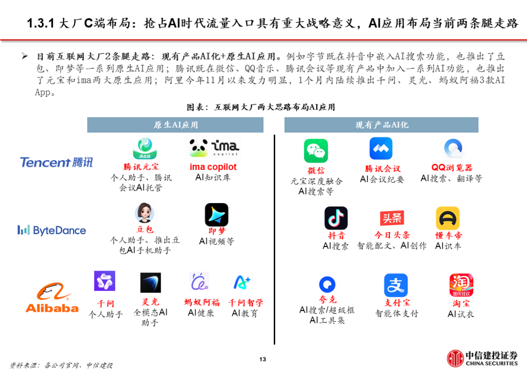3、AI应用 超级APP,大厂打通生态,强化已有优势,赋能AI产品。字节、阿里、腾讯均依托已有生态布局AI,将AI产品/功能与现有超级APP打通,如豆包 抖音、千问 淘系平台 高德、微信 元宝。