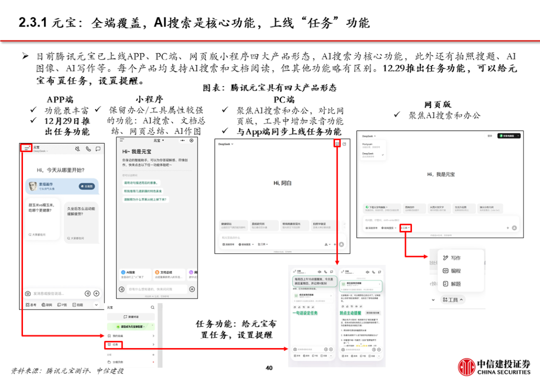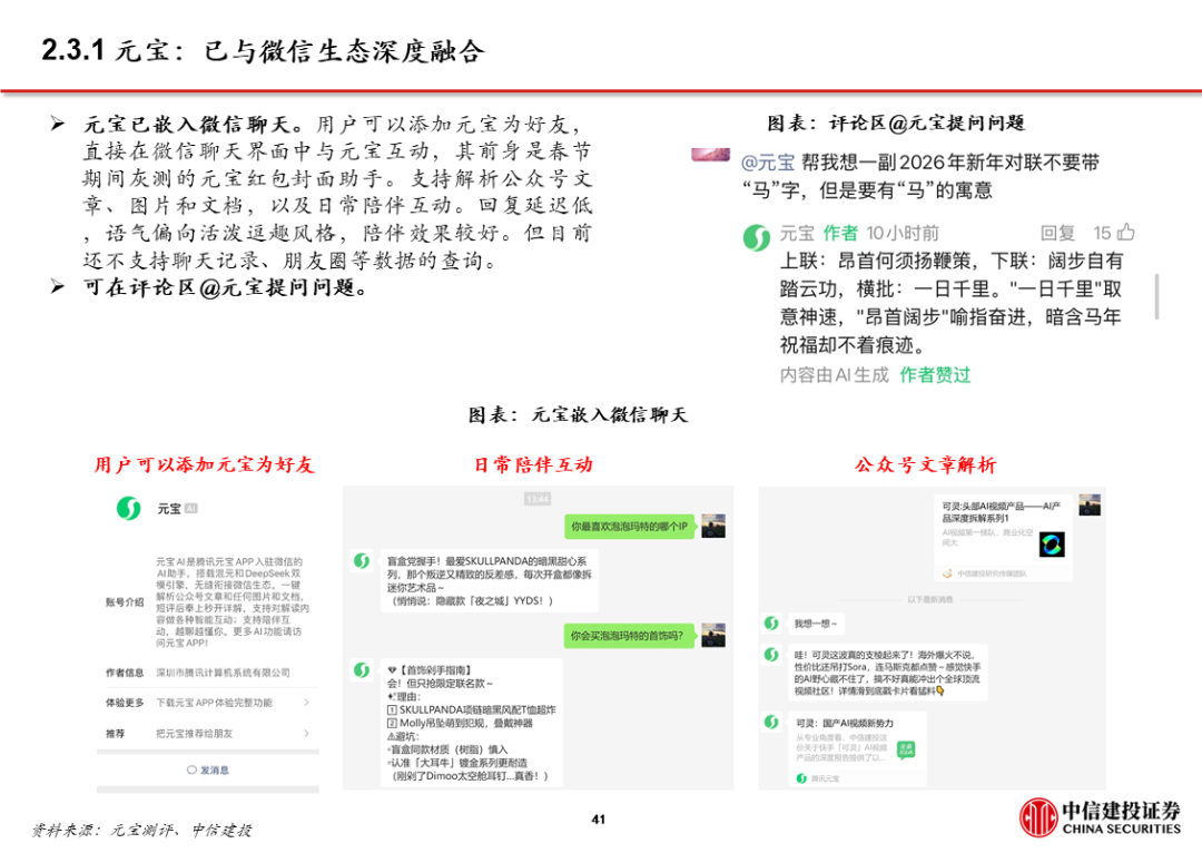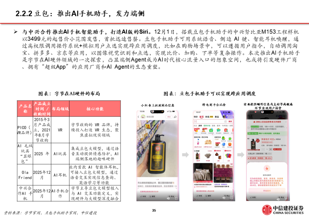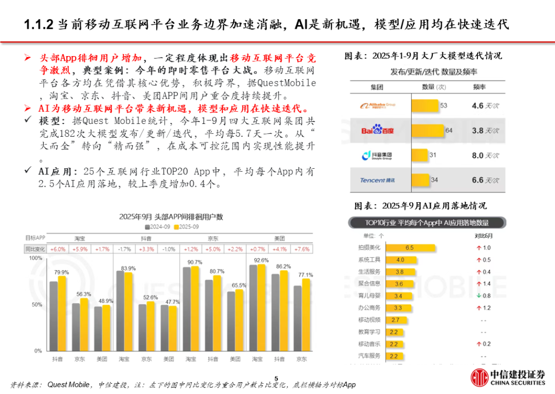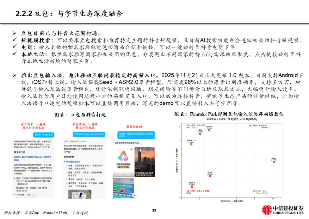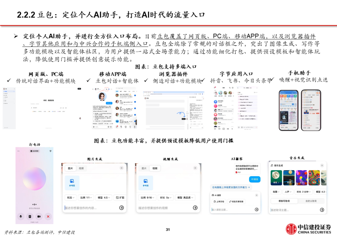 3、AI应用 超级APP,大厂打通生态,强化已有优势,赋能AI产品。字节、阿里、腾讯均依托已有生态布局AI,将AI产品/功能与现有超级APP打通,如豆包 抖音、千问 淘系平台 高德、微信 元宝。