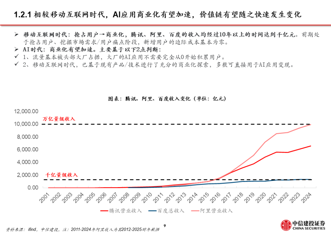 4、AI时代商业化有望加速。当前C端AI应用流量的主要玩家仍然是传统移动互联网大厂,他们可以复用移动互联网时代已经成熟的商业化变现路径,将其直接用于AI应用变现。