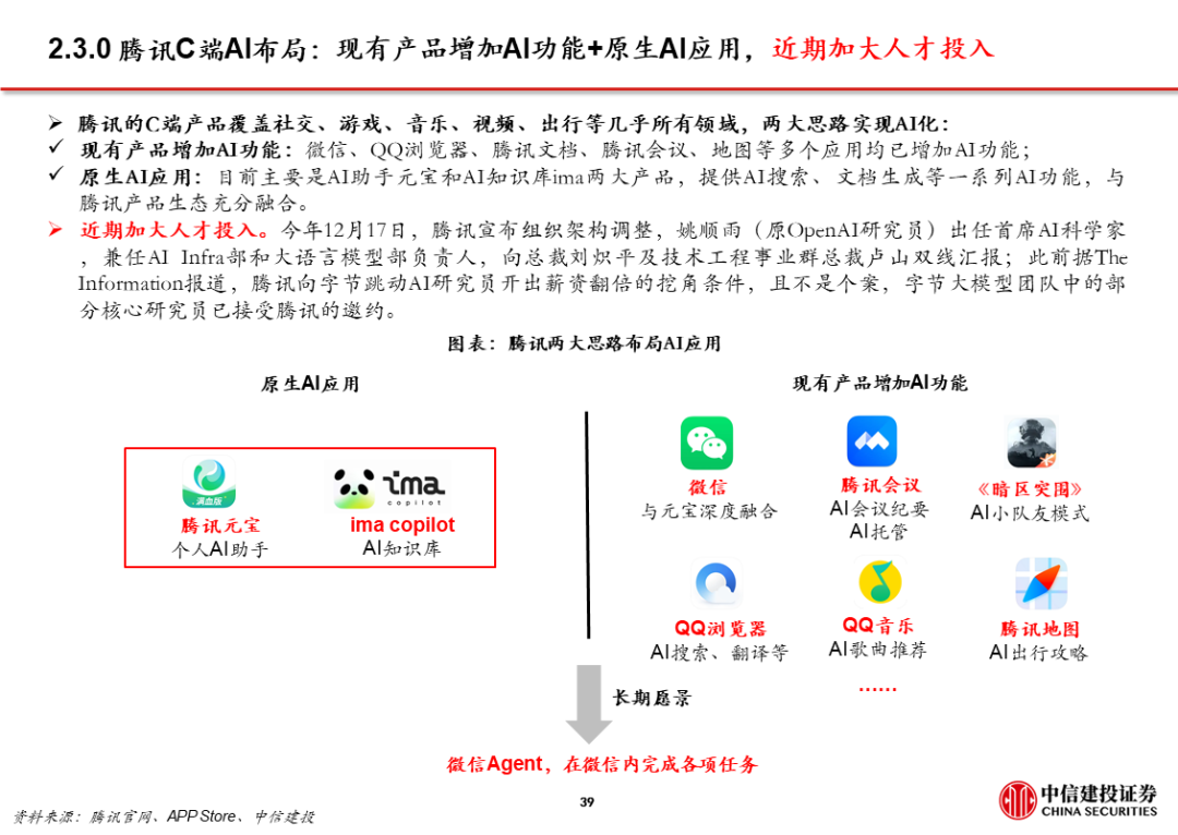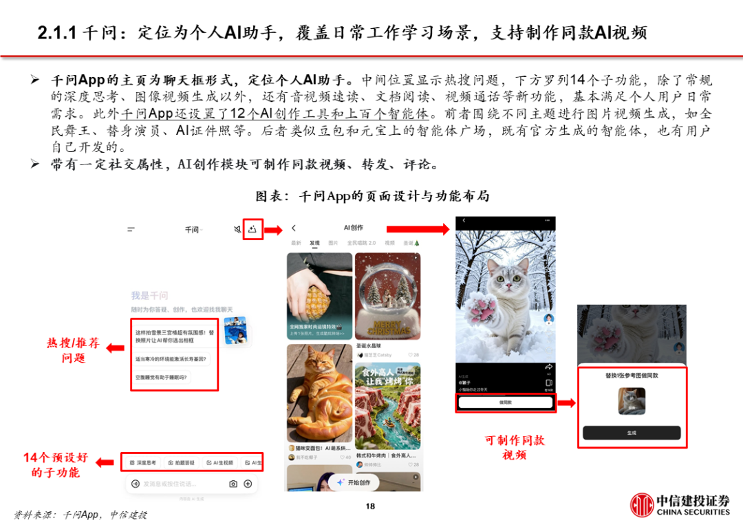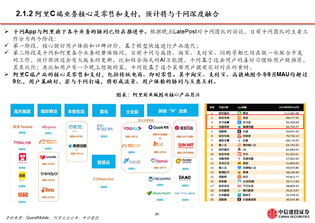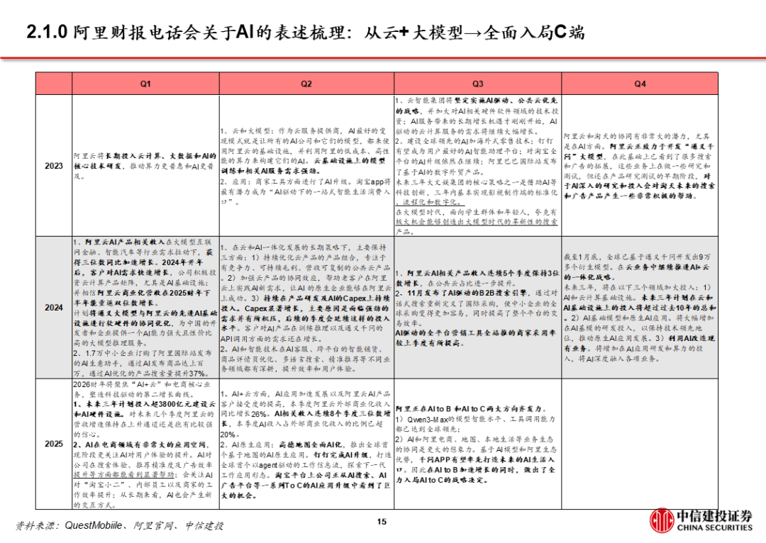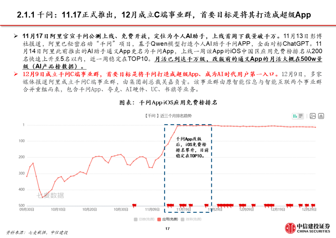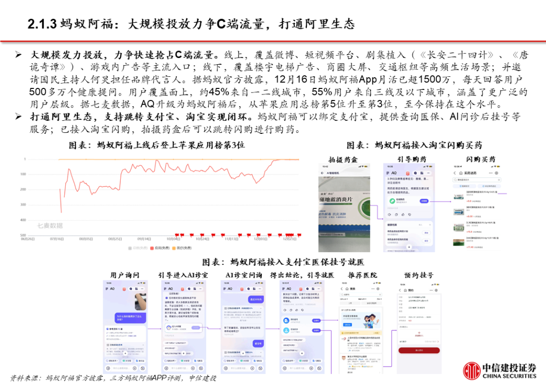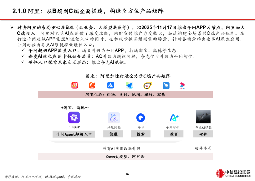 2、阿里:以千问为转折点,显著加快C端布局步伐。阿里推出千问App后的1个半月,陆续推出灵光、蚂蚁阿福、千问智学App;阿里现有的C端产品布局中,既有入口型产品千问,也有围绕金融、健康、教育等垂类产品。