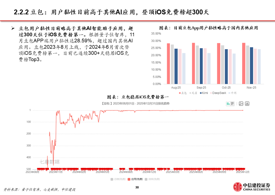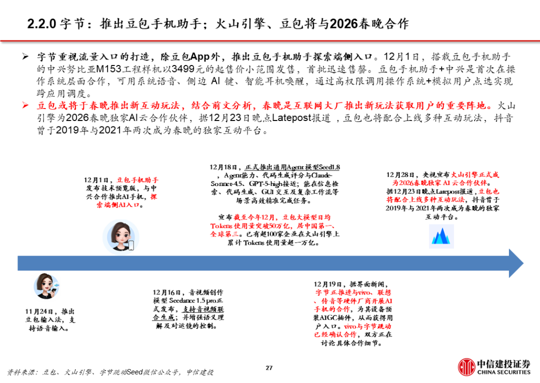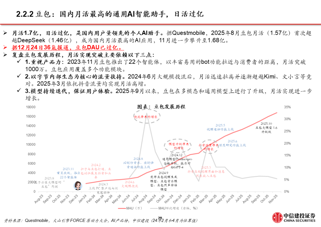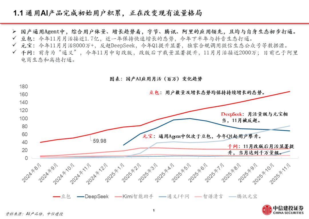 1、豆包:用户量规模最大且步伐加快。目前豆包日活已过亿。据AI产品榜,11月豆包月活1.7亿,同比增长接近2倍,是国内用户数量最大的通用C端AI应用。11月推出豆包手机助手并与硬件厂商合作,尝试在操作系统层面获取入口流量。同时,火山引擎成为2026春晚独家AI云合作伙伴,豆包将配合上线新玩法,春晚冠名/节目往往传递了次年重大热点和市场变化。