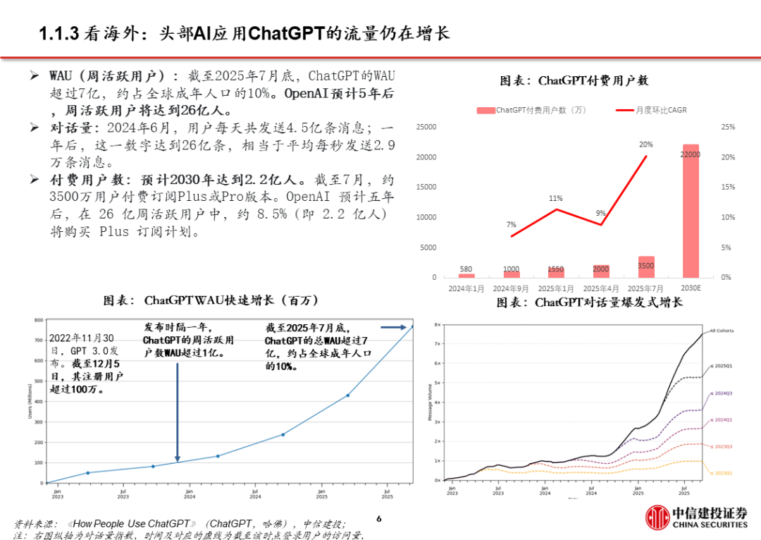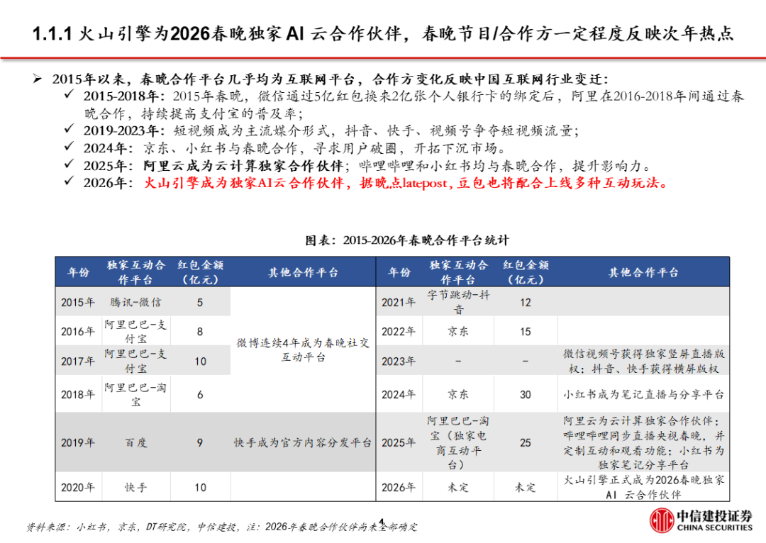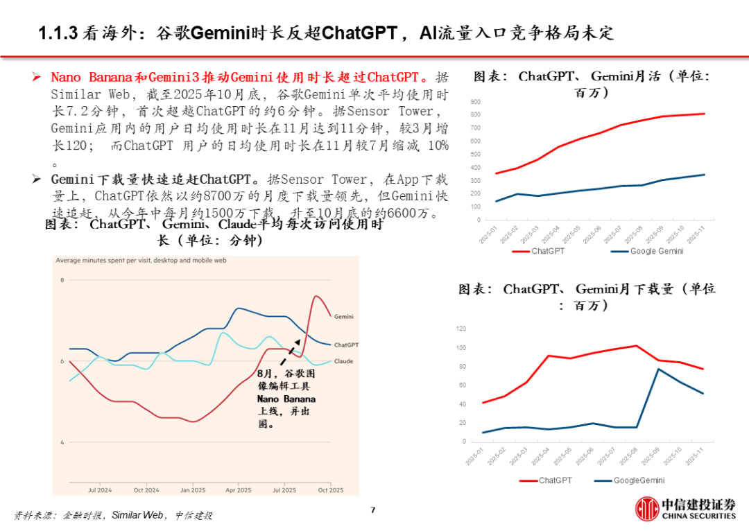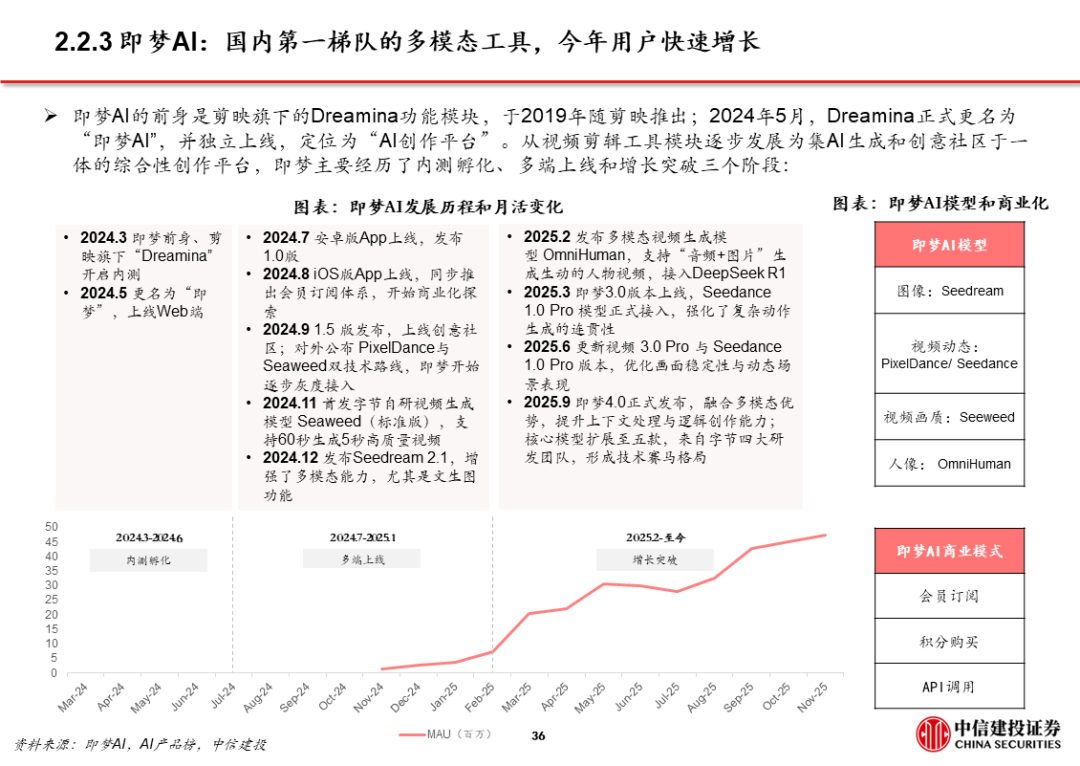 1、豆包:用户量规模最大且步伐加快。目前豆包日活已过亿。据AI产品榜,11月豆包月活1.7亿,同比增长接近2倍,是国内用户数量最大的通用C端AI应用。11月推出豆包手机助手并与硬件厂商合作,尝试在操作系统层面获取入口流量。同时,火山引擎成为2026春晚独家AI云合作伙伴,豆包将配合上线新玩法,春晚冠名/节目往往传递了次年重大热点和市场变化。