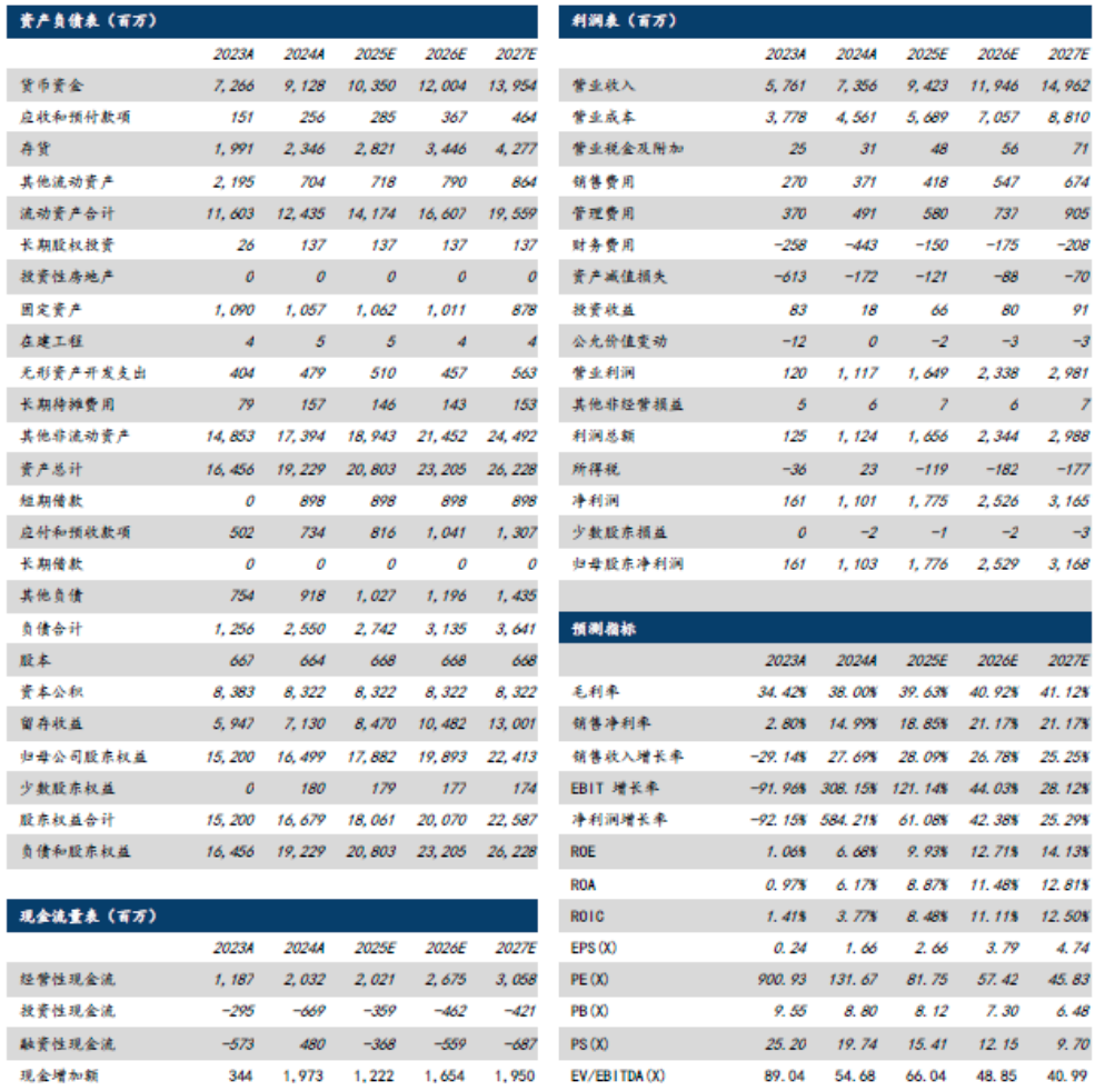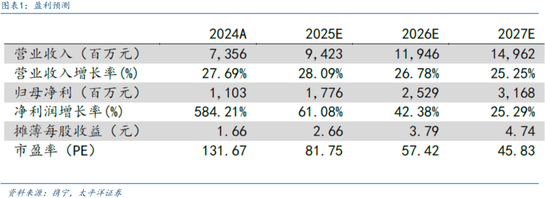 盈利预测与投资建议:预计2025-2027 年营业总收入分别为94.23、119.46、149.62亿元,同比增速分别为28.09%、26.78%、25.25%;归母净利润分别为17.76、25.29、31.68亿元,同比增速分别为61.08%、42.38%、25.29%,对应25-27 年PE 分别为82X、57X、46X,维持“买入”评级。