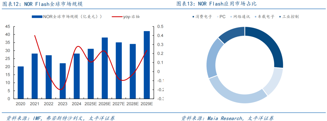 端侧AI 汽车电子推动NOR市场规模持续扩容,预计29年市场规模将达到42亿美元。NOR Flash市场迎来AI智能终端驱动的上行周期,根据弗若斯特沙利文数据,NOR Flash全球市场规模23年22亿元,24年开启新一轮上行周期,市场规模增长至28亿美元,同比增速27%,并预计在29年增长至42亿美元,年复合增速8.4%,需求端扩容主要得益于消费类终端设备如智能手机、PC、可穿戴、智能家居AI化转型,新应用场景如AI眼镜的落地,对数据处理和存储能力需求显著提升,叠加汽车三化推进,驱动车规级存储需求激增。