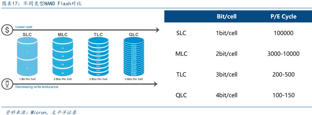 NAND可分为SLC、MLC、TLC和QLC NAND四种类型,SLC NAND具备高可靠性、寿命更长等特点。NAND Flash按存储单元密度可划分为SLC、MLC、TLC和QLC四类,其核心差异在于每个存储单元所能存储的bit分别为1、2、3、4bit。SLC每个单元存储1bit数据,具备10万次擦写寿命和高速读写特性,且每位元成本高,因此在需要对高性能、高可靠有需求的工业控制、汽车电子等领域优势显著;MLC在性能与成本间取得平衡,适用于汽车电子与主流工业场景;TLC和QLC拥有更高的存储容量和更低的成本,因此适用于消费级固态硬盘与移动设备等大容量存储市场。