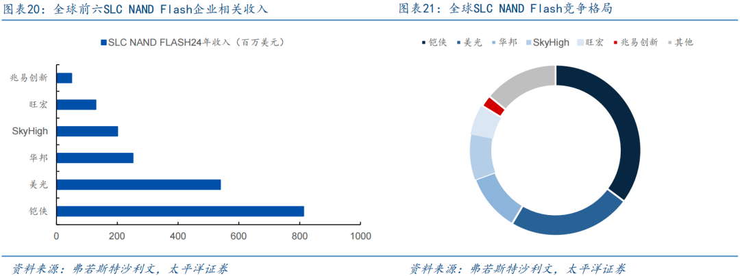 海外大厂逐步淡出,为国产替代带来广阔空间。全球SLC NAND市场份额高度集中于海外及中国台湾厂商,根据弗若斯特沙利文数据,24年铠侠市场份额35.2%,美光市场份额23.3%,华邦市场份额10.9%,前三大厂商合计占比69.4%,市场呈现高度集中格局。伴随近年来海外大厂产能向3D NAND倾斜,SLC NAND业务战略性收缩,中国大陆厂商把握国产替代机遇,在多个下游应用市场如工控、汽车电子等实现份额崛起,兆易创新24年全球市场份额达到2.2%,全球排名第六、内地排名最高。