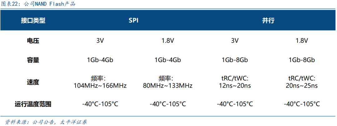 公司38nm和24nm两种制程的产品全面量产,以24nm为主要工艺制程。公司产品容量覆盖1Gb~8Gb,采用3V/1.8V两种电压供电,具有高速、高可靠性、低功耗的特点,其中SPI NAND Flash在消费电子、工业、汽车电子等领域已经实现全品类的产品覆盖。公司25年上半年推出采用24nm工艺节点的GD5F1GM9系列高速QSPI NAND Flash,凭借突破性的读取速度和创新的坏块管理功能,有效解决传统SPI NAND Flash响应速度慢、易受坏块干扰的行业痛点,并融合NOR Flash高速读取优势与NAND Flash大容量、低成本优势的新型解决方案,满足工业、IoT等快速启动应用场景的需求。