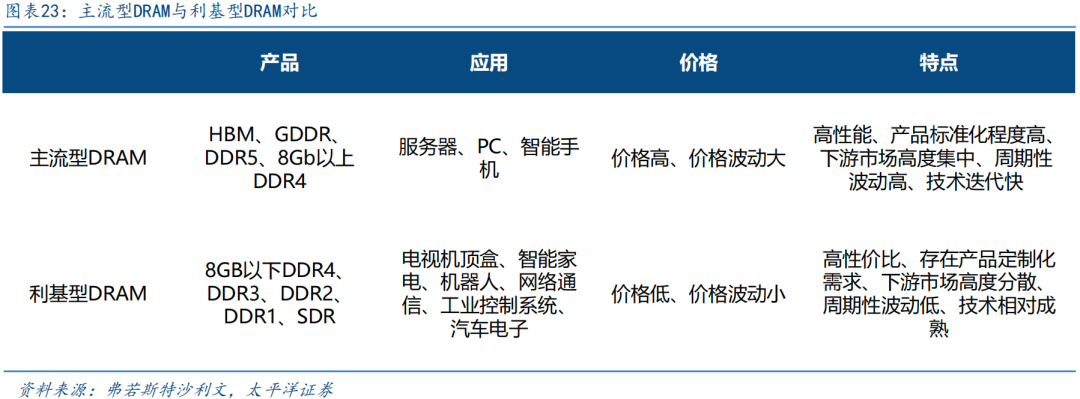 利基型DRAM下游市场分散,存在定制化需求。主流型DRAM主要聚焦在大容量、高传输速率的DDR5、LPDDR5,以及8Gb以上的DDR4等,聚焦先进制程,广泛应用于服务器、PC、智能手机等场景,需求与全球宏观经济及云基建投资周期高度相关,价格波动性较为显著。利基型DRAM主要包括8Gb及以下容量的DDR4/LPDDR4以及前代产品DDR3、DDR2、LPDDR2/3等,聚焦于成熟制程,提供长期稳定供应、高可靠性、更优性价比及定制化能力,满足下游场景对长产品生命周期的需求,因此其市场更为分散和稳定,受尖端技术迭代的直接冲击较小,市场波动相对温和。