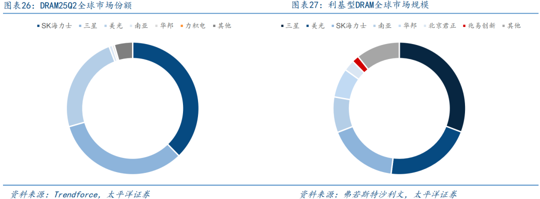 海外大厂产能分配削减,国产厂商突围。为应对高性能计算对HBM、DDR5和LPDDR5产品的爆发性需求,三星、SK海力士、美光等海外大厂自23年开始陆续将传统DRAM产能战略性转向高价值量产品领域,逐步退出DDR3市场,同时大幅削减DDR4等利基型产品的产能分配。海外大厂的退出使得供给端出现缺口,为中国台湾及中国大陆厂商突围带来历史性机遇。三星、SK海力士、美光合计占据约69%的市场份额,中国台湾厂商华邦和南亚承接三大厂产能转向高端产品后留下的市场空间,大陆厂商如北京君正、兆易创新等整体份额加速成长,兆易创新市场份额约1.7%。