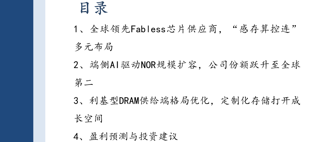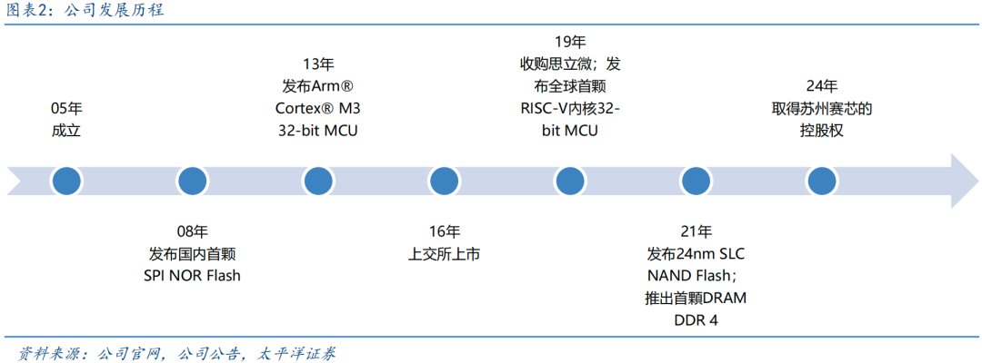 全球领先的芯片设计公司,“感存算控连”布局不断深化。公司于05年创立,于16年上市,是全球领先的Fabless芯片供应商,主营产品包括Flash、利基型DRAM、MCU、模拟芯片和传感器芯片,以及完整的系统及解决方案等。公司08年发布国内首颗SPI NOR Flash,打破海外垄断格局;公司13年发布Arm® Cortex® M3 32-bit MCU,构建存储器 微控制器双轮驱动格局;公司19年收购上海思立微,切入传感器赛道,同年SPI NOR Flash产品通过AEC-Q100车规认证;公司24年收购苏州赛芯,补强模拟芯片业务,形成从单一产品线到存储 微控制器 传感器 模拟的完善产品线矩阵。