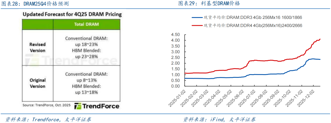 受供给端缺口影响,利基型DRAM价格自25Q2持续走高。三星、SK海力士以及美光因战略性转向HBM和DDR5等高端产品,持续削减利基型产品产能,算力基建带来的巨大需求导致利基型DRAM供给端出现收缩,自25Q1末,利基型产品库存去化处于尾声,迎来价格企稳回升。叠加需求侧受益于端侧AI、汽车电子领域高景气,以及工业控制领域稳健增长形成持续拉动,利基型DRAM价格自25Q2开始进入快速上行通道。预计供需错配有望延续,利基型DRAM产品价格Q4预计进一步上行,并在26年维持相对较好水平。