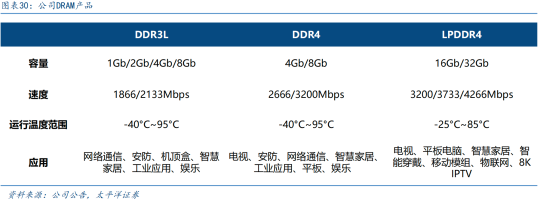公司深耕存储芯片多年,产品覆盖NOR Flash、NAND Flash和利基型DRAM。公司是国内首家SPI NOR Flash容量覆盖512Kb至2Gb完整产品线的厂商,电压覆盖至1.2V低电压和超低功耗模式,NOR业务24年全球第二、国内第一,市场份额18.05%,并在25年率先实现45nm节点大规模量产。公司NAND产品主要为SLC NAND,应用于工控、汽车电子、通信设备等。公司利基型DRAM产品包DDR3L/DDR4/LPDDR4等,容量覆盖1Gb至8Gb,份额在全球市场加速成长,应用于机顶盒、电视、网络通讯、智慧家庭装置、智能可穿戴、信息娱乐等领域。