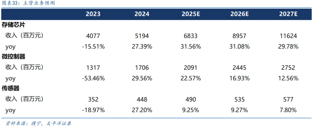 公司持续丰富DRAM产品矩阵,预计26年量产LPDDR4。公司利基型DRAM产品线基本铺齐,产品品类持续扩张,已包括DDR3L/DDR4/LPDDR4等,具备低功耗、体积小的特点,主要应用于机顶盒、电视、网络通讯、智能家庭装置、智能穿戴、信息娱乐系统等多个领域。公司DDR4 8Gb较快抢占份额,进入25Q3销量已经与DDR4 4Gb基本相当,预计26年将实现自研LPDDR4系列产品的量产,并着手规划LPDDR5小容量产品的研发。25年公司利基型DRAM业务营收有望超预期达成年初计划同比增长50%的目标,25年下半年利基型DRAM收入有明显增长,有望超越MCU业务成为公司第二大产品线。