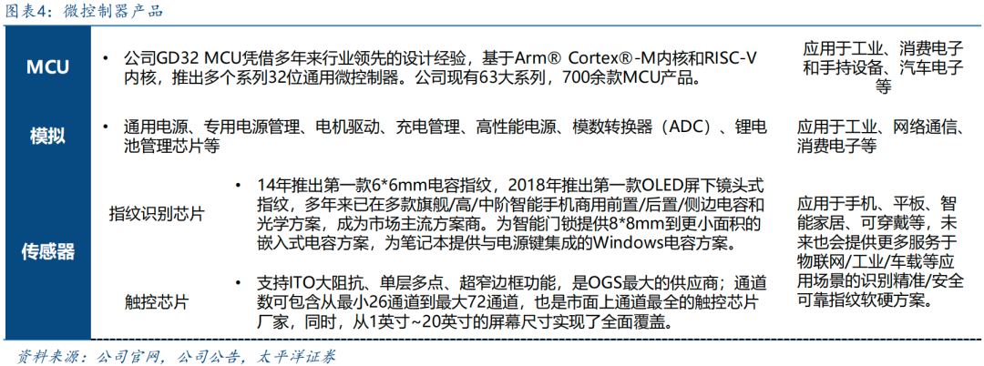 公司微控制器、模拟、传感器产品线多维拓展。公司是国内微控制器行业龙头,业务主要包括ARM和RISC-V内核的32位通用MCU产品,下游应用覆盖工业(工业自动化、能源电力及医疗设备等)、消费电子及手持设备、汽车电子(汽车导航、T-BOX、汽车仪表、汽车娱乐系统等)。公司模拟芯片包括通用电源(DCDC、LDO)、专用电源(耳机充电仓电源、扫地机器人电源)、电机驱动产品以及温度传感器等。公司传感器芯片业务包括指纹识别芯片和触控芯片,并将进一步拓展在PC、可穿戴、移动健康、物联网等领域布局。