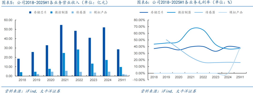 存储 MCU贡献主要收入来源。分产品品类来看,存储芯片贡献公司第一大营收来源,收入规模从18年的18.39亿元增长至24年的51.94亿元,年复合增速19%,25年上半年受益于海外大厂产能退出,公司利基型DRAM业务迎来量价齐升,实现营收28.45亿元,同比增长9%。MCU业务营收从18年的4.04亿元增长至24年的17.06亿元,年复合增速27%,25年上半年实现营收9.59亿元,同比增速19%,网通领域大幅增长。传感器和模拟芯片补充多元化产品线矩阵,传感器收入由19年2.03亿元增长至24年4.48亿元,年复合增速17%,模拟芯片24年收入1.52亿元。