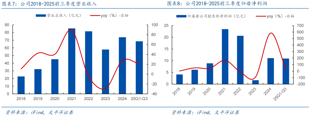 下游需求景气度回暖,公司营收、利润增速靓丽。公司21-23年受下游市场景气度低迷影响,收入分别为81.50/81.30/57.61亿元,同比增速分别为89.25%/-4.47%/-29.14%,归母净利润分别为23.37/20.53/1.61亿元,同比增速分别为165.3%/-12.16%/92.15%,24年行业迎来回暖,公司销售大幅提升,实现营业收入73.56亿元,同比增速27.69%,归母净利润11.03亿元,同比增速584.21,公司25年受益下游需求旺盛,以及海外大厂退出利基市场,延续量价齐升趋势,25年前三季度实现收入68.32亿元,同比增速20.92%,归母净利润10.83亿元,同比增速30.18%。