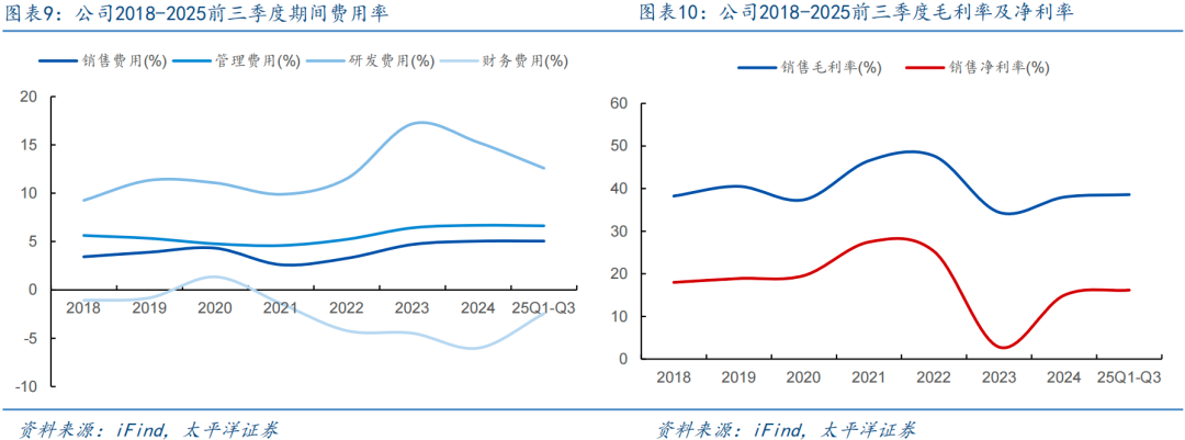 存储产品量价齐升,产品结构优化,带动毛利率提升。公司自24年以来毛利率不断优化,24年毛利率38.00%,同比增加15.38pct,25年三季度单季度毛利率达到40.72%,环比增长3.7pct,主要得益于存储行业迈入周期向上区间,供需格局好转,公司存储产品量价齐升,带动毛利率整体增长。公司25年前三季度净利率16.17%,同比增加1.44pct,公司期间费用率管控能力优异,销售、管理、研发、财务费用率分别为5.05%、6.63%、12.59%、-2.46%,同比变动 0.14、 0.73、-2.38、 0.50pct。