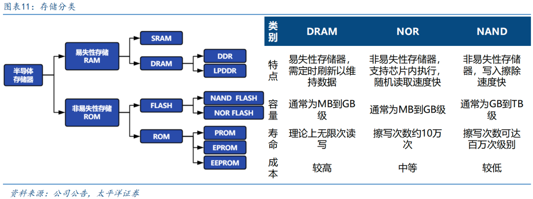 存储根据断电后数据是否保留,划分为易失性存储器与非易失性存储器两大类别。易失性存储器包括动态随机存储器(DRAM)、静态随机存储器(SRAM)等,非易失性存储器包括NAND Flash、NOR Flash和只读存储器(ROM)等。NOR主要用于代码存储/执行,读取速度快,写入擦除速度较慢,存储密度更低,主要用于智能手机、可穿戴、汽车、工控等终端领域需要快速启动和高可靠场景;NAND主要用于大容量数据存储,连续读取速度快,写入擦除速度极快,存储密度高,主要用于工业、网通、消费电子、汽车等需要大容量和高可靠场景。
