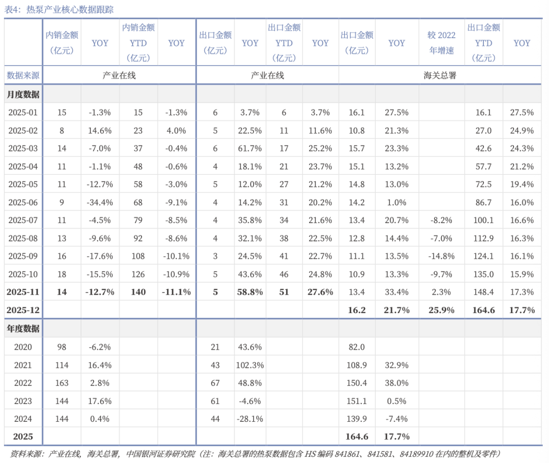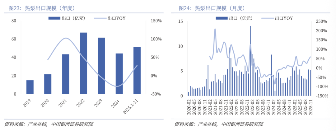3)2024年以来,欧洲多国陆续恢复或加强热泵补贴政策。2024年下半年起,欧美热泵逐步走出去库周期,单月增速逐步改善。由于同比基数偏低,2025年起热泵出口逐月改善,延续两位数同比增长。产业在线数据,2025年1-11月我国空气源热泵出口额累计同比增长27.6%;海关总署数据,2025年全年我国热泵相关产品及零部件出口额为164.6亿元,同比 17.7%,其中12月单月出口额为16.2亿元,同比 21.7%,连续第20个月实现同比增长。