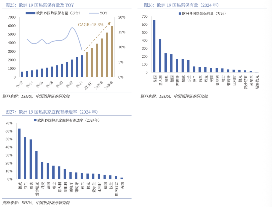 欧洲热泵渗透率提升空间大,欧盟设定2030年6000万台保有量目标。根据欧洲热泵协会数据,2024年欧洲19国热泵保有总量为2553.7万台,同比增长约9%,其中法国、意大利、瑞典是前三大国家市场,分别占比25.7%、16.4%、9.3%;2024年欧洲19国热泵保有量家庭渗透率为12%,其中有15个国家的渗透率低于22%,英国渗透率极低(仅1.9%),有很大的提升空间。根据2022年5月《欧洲可持续能源联合行动计划》,欧盟设定2030年达到6000万台热泵保有量的战略目标,为达此目标,2024-2030年热泵保有量复合增长率预计为15.3%,将带动我国热泵出口持续改善。