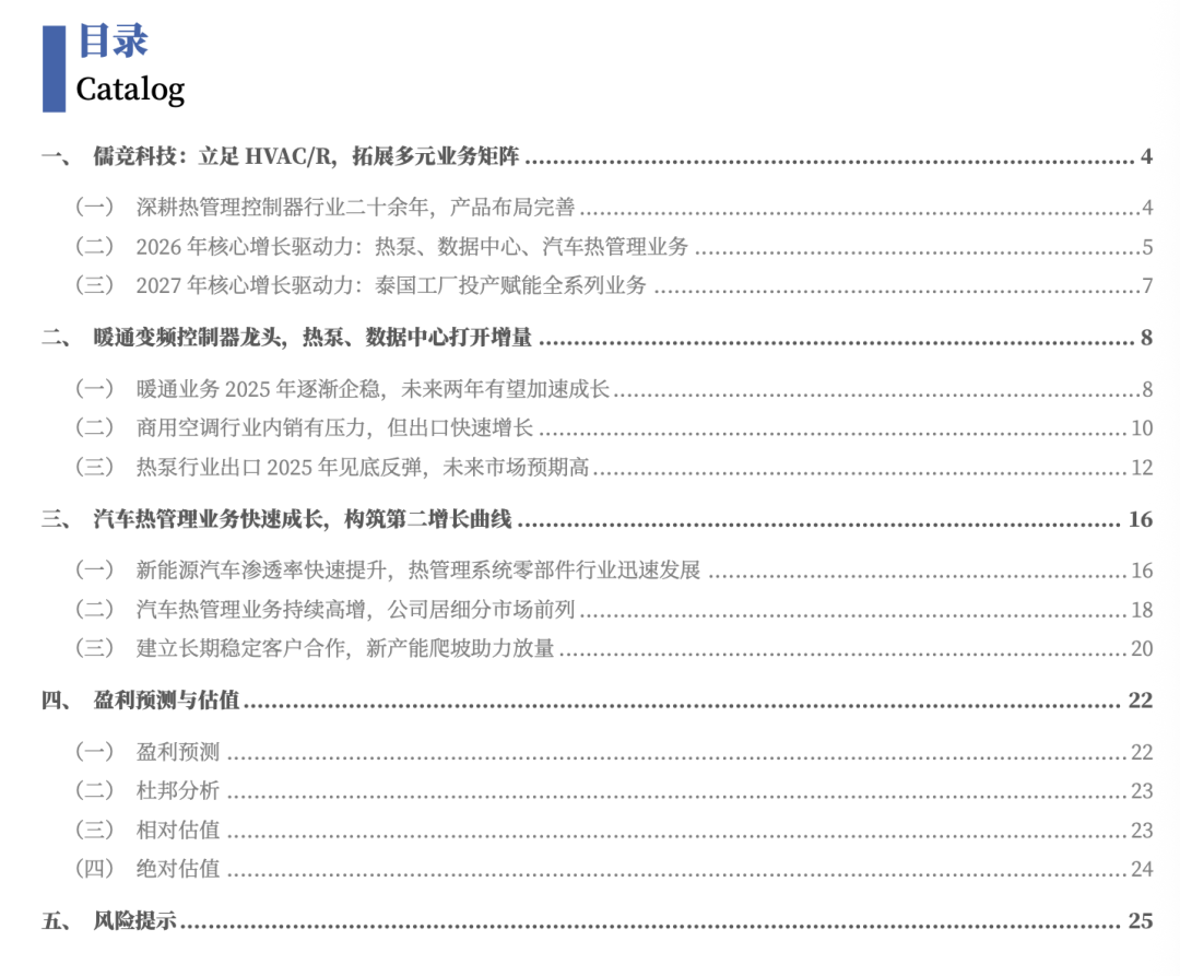 儒竞科技:暖通变频控制器龙头,向汽车热管理、工控领域拓展。公司已形成三大业务协同发展的战略:1)公司成立于2003年,以暖通设备控制器起家,是基本盘业务。下游客户包括艾默生、麦克维尔、阿里斯顿、海尔、三菱重工海尔、开利、博世等国内外大型厂商;2)2016年成立“儒竞电控”子公司进入新能源汽车热管理领域,近年持续高增,成为第二成长曲线。下游客户包括华暖通:商用空调受地产周期低迷影响,热泵、数据中心打开增长空间。2025H1,暖通业务收入4.22亿元,同比-4%,占比60%。暖通业务包括商用空调、热泵、家用空调三大板块:1)占大头的商用空调在国内地产周期低迷下,是主要拖累项,预计2026年仍将受到一定影响;2)热泵行业经历两年去库存后,2025年出口见底反弹,公司作为热泵控制器龙头,Q1-3热泵业务收入同比上升。欧洲热泵市场预期高,渗透率提升空间大,预计2026年公司热泵业务将有较好增长,并有望在2027年加速成长;3)全球数据中心市场增长强劲,公司切入数据中心赛道,构建“热管理 节能”双核心布局,增长势头良好,2026-2027年在低基数下有望明显增长域三电、上海光裕、科博乐等汽车零部件供应商;3)2014年成立“儒竞自控”子公司进入工业伺服领域,目前处于市场拓展阶段,业务体量小,未来有望随机器人行业增长逐步放量,或将成为第三成长曲线。