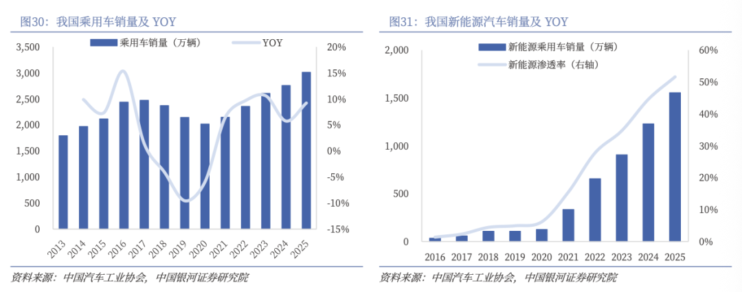 全球新能源汽车行业蓬勃发展,我国贡献全球过半产销。全球汽车行业的去碳化目标、新能源汽车技术的提升以及新能源汽车充电基础设施的发展,带动了全球新能源汽车行业快速发展。全球新能源汽车销量由2020年的520万台增加至2024年的2140万台,复合年增长率为42.7%,2020年至2024年,全球新能源汽车渗透率由6.7%上升至23.6%;而全球传统内燃机汽车销量则由2020年的7280万台减少至2024年的6920万台。国内方面,我国新能源汽车产业正处于快速成长期,贡献全球过半产销。2025年我国新能源汽车销售1554万台,新能源汽车销售渗透率同比 7pct至51.6%,渗透率快速提升。汽车以旧换新政策对新能源车补贴力度高于燃油车,叠加汽车下乡政策与购置税减免均只适用于新能源车,国内新能源车销量具备更强支撑。与此同时,智能网联和自动驾驶技术商业化正逐步展开,进一步提高新能源汽车的渗透率,推动汽车热管理系统零部件市场快速扩张。