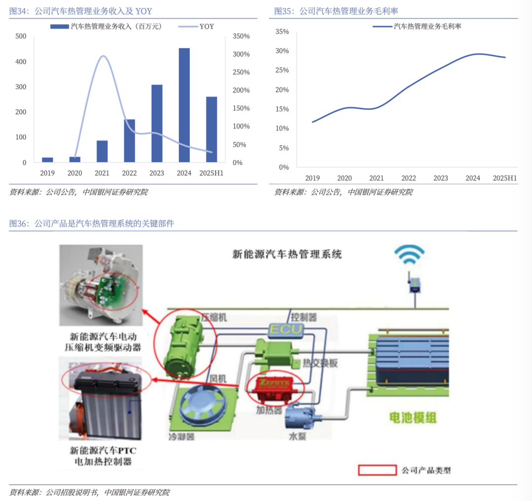 汽车热管理业务近年持续高增,已成为公司第二增长曲线。公司新能源汽车热管理业务近年保持高速增长,市占率持续提升。2019-2024年,收入自0.2亿元增长至4.5亿元,期间CAGR达88.4%。2025H1,公司汽车热管理业务实现收入2.6亿元,同比 28.2%;毛利率为28.3%,同比 3.3pct。2025年增速放缓的主要原因是2025H1公司新能源汽车电子和智能制造产业基地提前投产,受到产能搬迁和爬坡的阶段性影响;预计2026年将恢复高速增长。公司汽车热管理业务主要分为新能源汽车电动压缩机变频驱动器、PTC电加热控制器两大板块,2022年占汽车热管理业务的比分别为79.9%、20.1%。