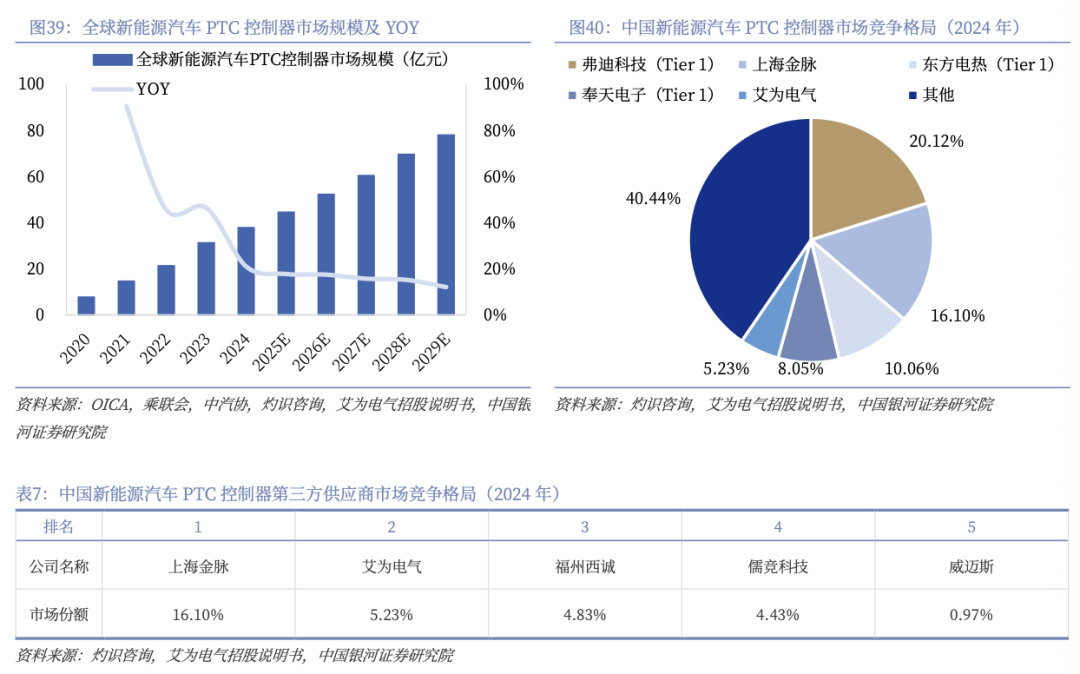 2)PTC电加热控制器:PTC控制器作为PTC加热器的重要控制部件,其全球市场规模亦随新能源汽车规模扩张而持续打开,自2020年的7.69亿元快速增长至2024年的37.76亿元,期间CAGR为48.9%。其中,中国市场增速更为突出,自2020年的2.25亿元增长至2024年的18.54亿元,期间CAGR达69.4%,显著高于全球水平,并有望于2029年达到33.41亿元。从市场竞争格局来看,2024年,公司在我国新能源汽车PTC控制器市场上的出货量市占率为4.43%,在第三方供应商中排名第四。