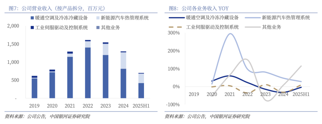 从产品结构来看,暖通业务为基本盘,新能源汽车热管理为第二增长曲线。2025H1,公司暖通业务/新能源汽车热管理业务/工业伺服业务分别实现收入4.22/2.60/0.17亿元,同比-4%/ 28.2%/ 9.3%,占比60.3%/37.2%/2.5%。其中,暖通业务在国内地产周期下行背景下,受商用空调业务拖累,但2025年全球热泵市场逐渐复苏,上半年公司热泵业务收入大幅上升;公司新能源汽车热管理业务近年持续高速增长,2025H1因公司新能源汽车电子和智能制造产业基地提前投产,受产能搬迁和爬坡的阶段性影响,增速放缓,但市占率进一步提升;工业伺服业务体量尚小,处于市场拓展阶段,25H1收入小幅增长,但已有深厚的技术积累,未来有望随行业增长逐步放量。