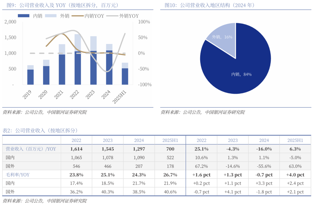 从地区结构来看,内销为主,外销受欧洲热泵行业波动影响。公司内销收入波动较为稳定,2019-2024年,自4.8亿元增长至10.9亿元,期间CAGR为17.7%;2024年内销占比达84%,贡献公司主要收入利润。2025H1内销收入5.2亿元,同比-5%,主要系地产周期低迷影响。外销方面,公司产品销往北美、欧洲、东南亚等多个国家和地区,其中欧洲市场是核心市场(2022年在外销中的占比超过80%),2025H1,公司外销收入1.8亿元,同比 63%,主要系全球热泵市场去库存结束,需求迎来拐点。