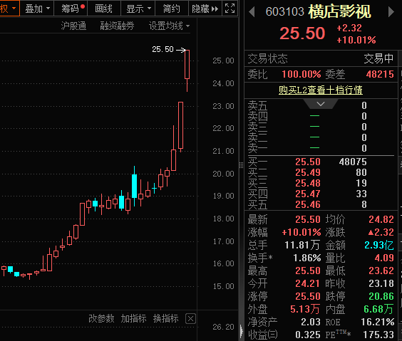 影视院线股连续强势,横店影视(603103)收获两连板,截至目前,公司投资出品的《熊出没·年年有熊》《飞驰人生3》《星河入梦》等影片已定档2026年春节档;幸福蓝海、光线传媒涨超10%,金逸影视、博纳影业等跟涨。
