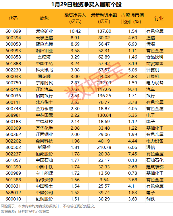 具体到个股,1月29日共有1614只股获融资净买入,净买入金额在1亿元以上的有52只,紫金矿业融资净买入额居首,当日净买入10.42亿元;其次是天孚通信、蓝色光标,融资净买入金额分别为8.91亿元、8.69亿元;融资净买入金额居前的还有洛阳钼业、五粮液、中国中免等。
