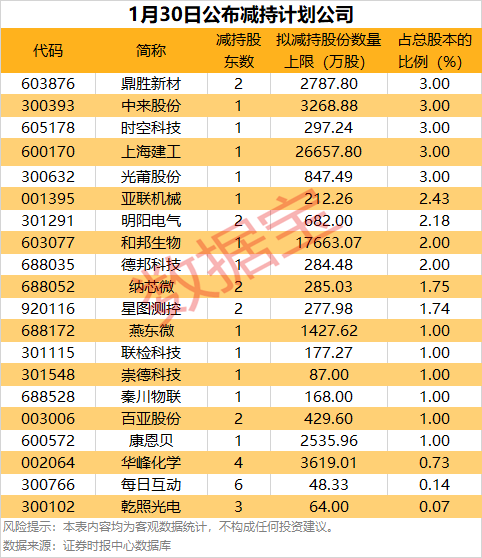 统计显示,1月30日共有20家公司披露股东减持计划,鼎胜新材、中来股份、时空科技等公司拟减持比例居前。