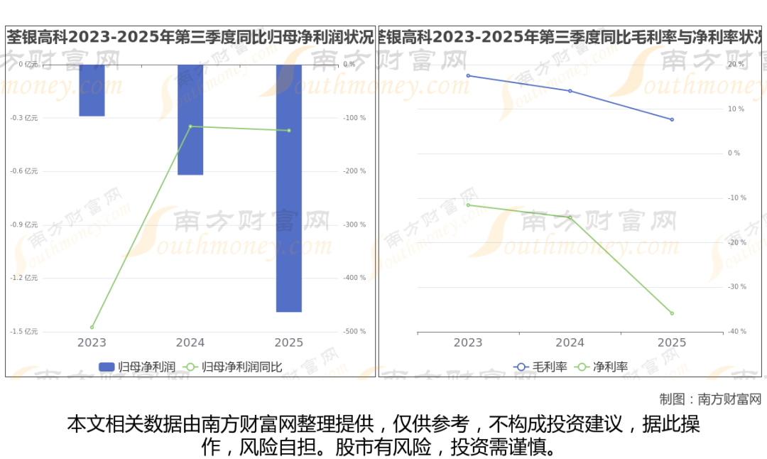 公司2025年第三季度季报显示,荃银高科实现净利润-1.39亿,同比增长-123.34%;毛利润为3800.88万,毛利率7.64%。