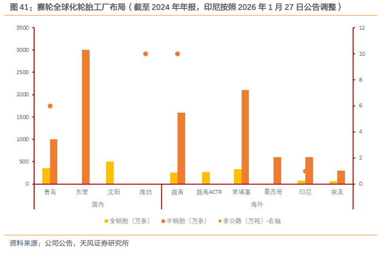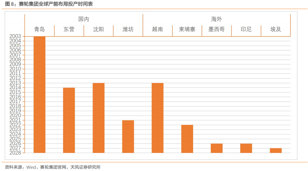 赛轮集团是中国首家在海外建厂并最早在海外两个国家拥有规模化轮胎生产基地的轮胎企业,这种前瞻性战略布局已成为公司应对国际贸易壁垒的重要手段。公司在中国的青岛、东营、沈阳、潍坊及海外越南、柬埔寨、墨西哥、印尼建有轮胎生产基地,埃及、沈阳新和平生产基地计划启动建设,作为最早“出海”的轮胎公司,已形成了全球化影响力,开启出海2.0。