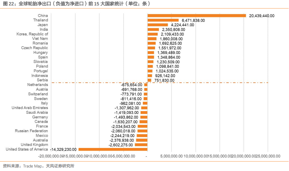 根据Trade Map统计的全球轮胎净出口数据,2023年全球轮胎净出口前十大国家分别为:中国、泰国、日本、印度、韩国、越南、罗马尼亚、捷克、匈牙利、西班牙,亚洲、欧洲为全球轮胎主要出口国家所在地;而全球净进口前十大国家分别为:美国、英国、澳大利亚、墨西哥、俄罗斯、法国、加拿大、德国、沙特阿拉伯、阿联酋。