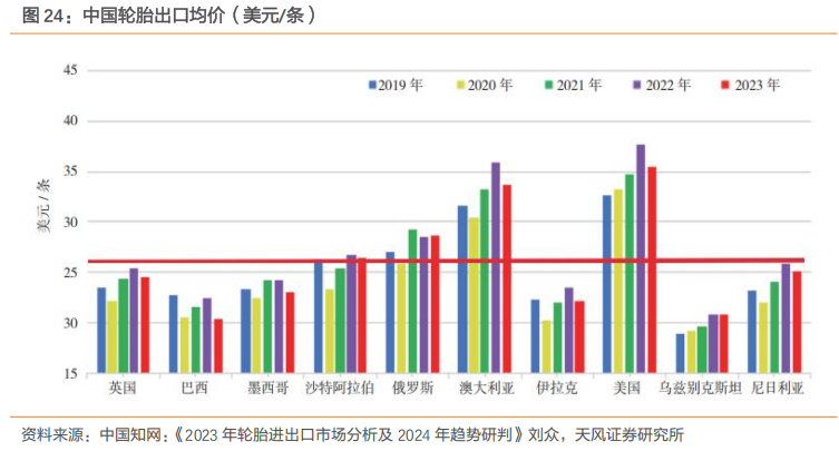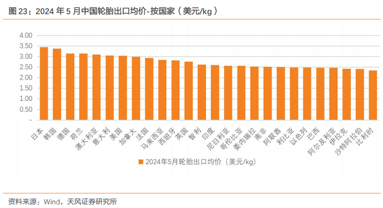 根据海关数据对我国出口到26个国家半钢胎平均价格(按照美元/kg算)的统计,以2024年5月出口数据为例,日本和韩国分列一二位,分别为3.45和3.38美元/kg,而德国、荷兰、澳大利亚、意大利四个欧洲和澳洲国家位列3-6位,美国则以3.05美元/kg位列第七。