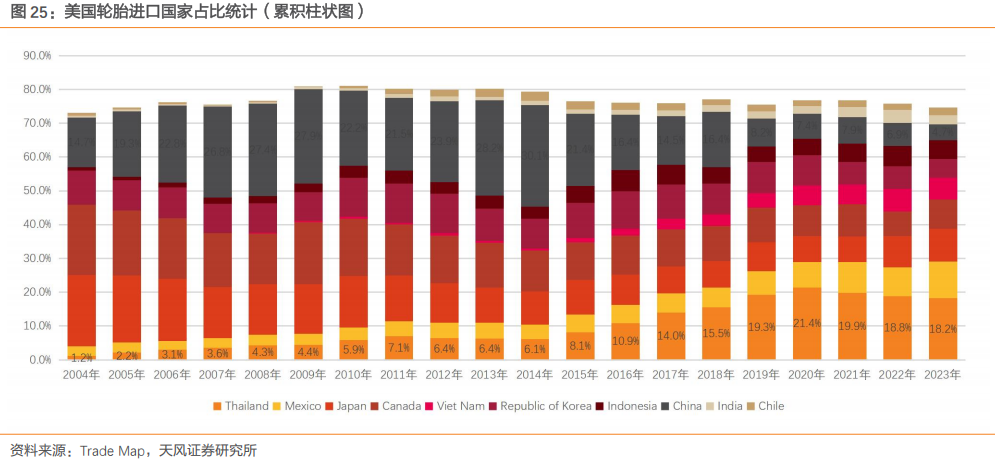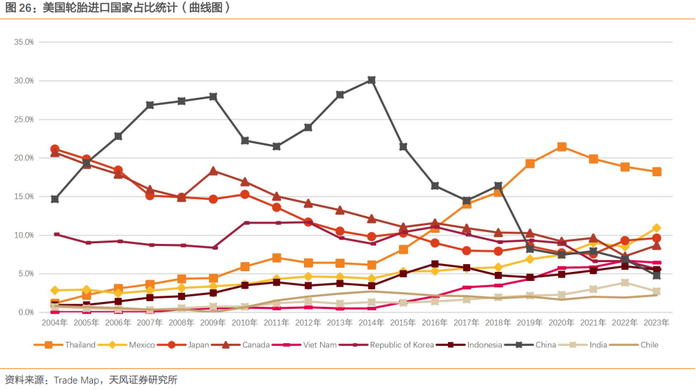 根据Trade Map统计数据,美国轮胎进口国家占比在过去20年间发生了较大变化,中国轮胎自2004年占美国轮胎进口总数的14.7%,经过3年时间,到2007年快速提升至26.8%,并在2014年达到顶峰的30.1%。但由于美国2014年对华半钢胎开启的双反调查,并征收较高的反倾销、反补贴关税,中国轮胎出口美国占比一路下行,截至2023年,中国直接出口美国轮胎仅占美国进口轮胎总量的4.7%。